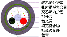 產(chǎn)品型號(hào): GYSTY53也叫(GYTY53) 光纖松套 纜芯填充油膏 金屬中芯加強(qiáng)PE內(nèi)護(hù)套 雙面涂塑軋紋鋼帶粘結(jié)PE外護(hù)套 | ||||